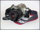 Frühe Autofokus-SLR von Canon, Japan, 1996. Eine Amateurkamera für das Kleinbildformat 24 x 36 mm. Im Prismenaufsatz eingebauter E-Blitz mit Leitzahl 14 bei ISO 100 (hier zugeklappt). Multiprogrammautomatik, Schlitzverschluss 30 bis 1/2000 sec. Wechselobjektive EOS-Bajonett - hier mit Zoom 1:4-5,6/35-80 mm USM. Eingebauter Winder. |